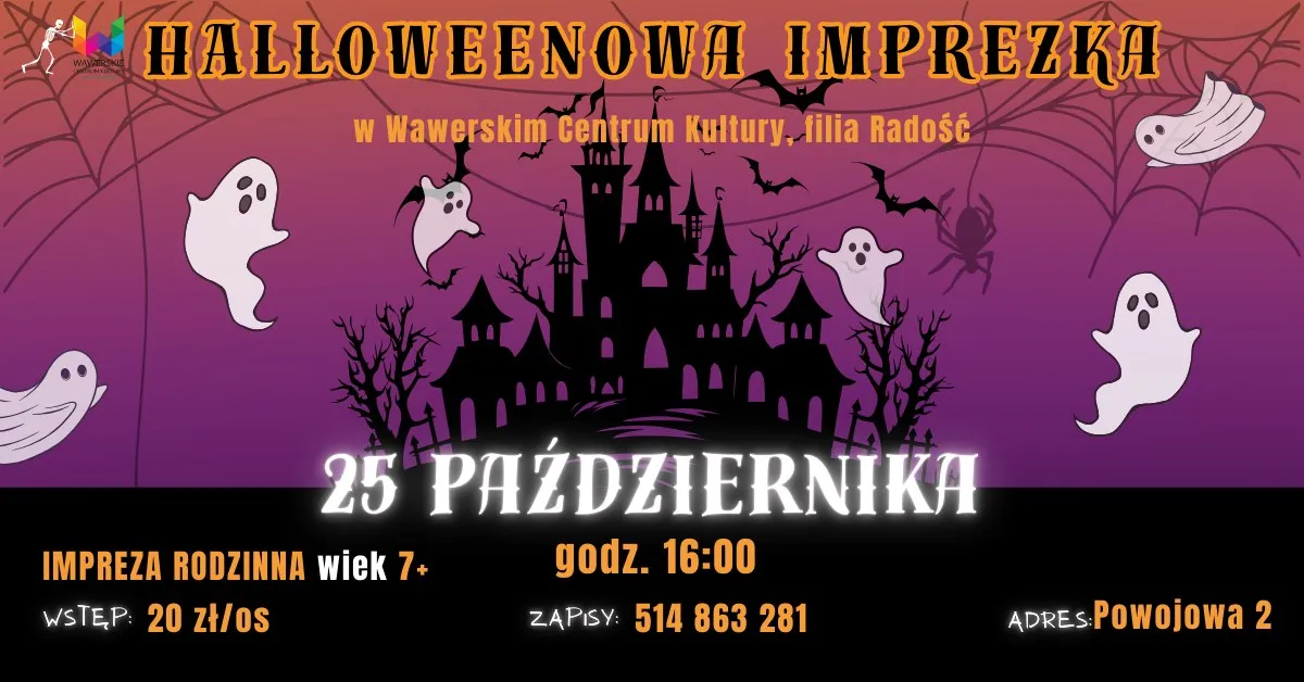 WCK Radość zaprasza dzieci (7+) i rodziców na halloweenowe popołudnie pełne dreszczyku i zabawy! Czekają warsztaty plastyczne, taneczne i muzyczne, konkurs na najlepsze przebranie, quiz halloweenowy, fotobudka, strefa przekąsek oraz występ taneczny do „Thrillera” Michaela Jacksona.