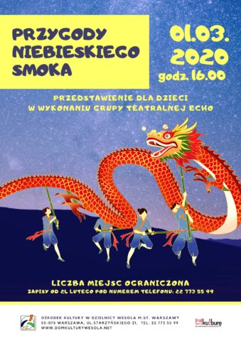 1 marca (niedziela) godz. 16.00 – Przygody Niebieskiego Smoka. Przedstawienie dla dzieci w wykonaniu Grupy Teatralnej Echo.