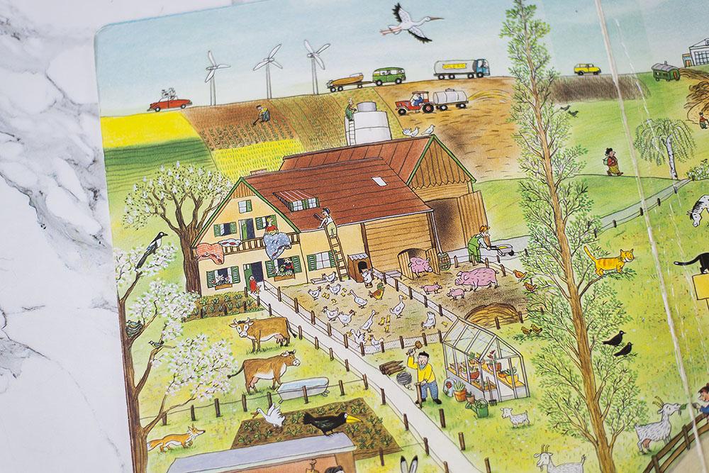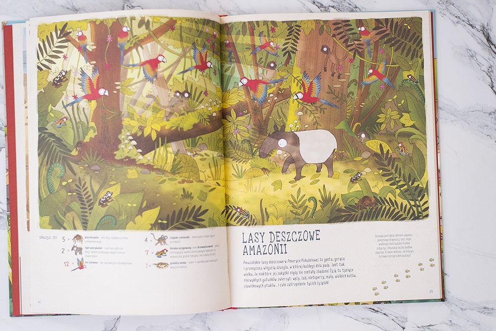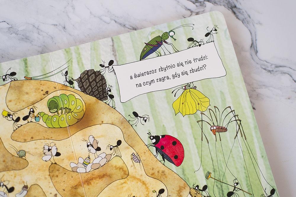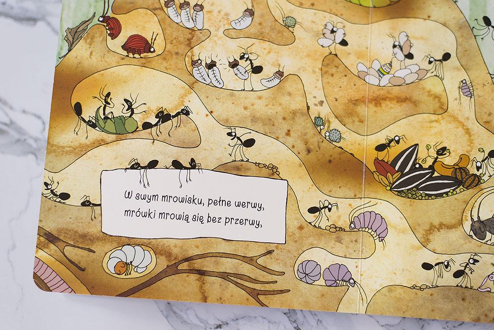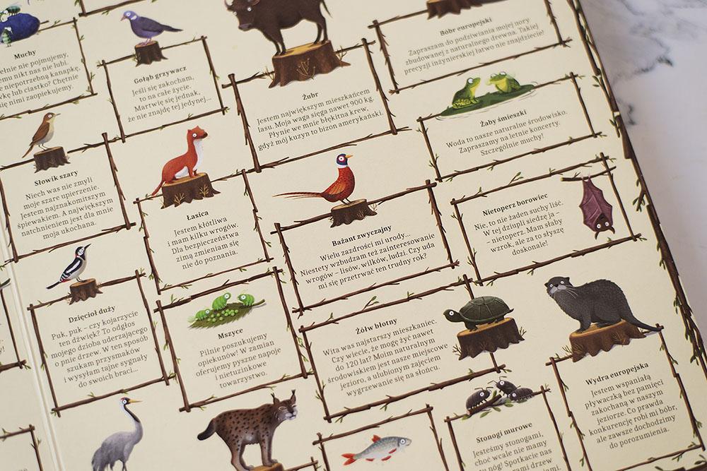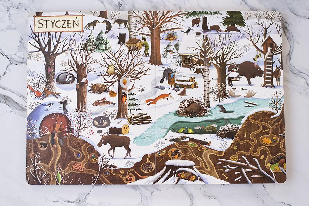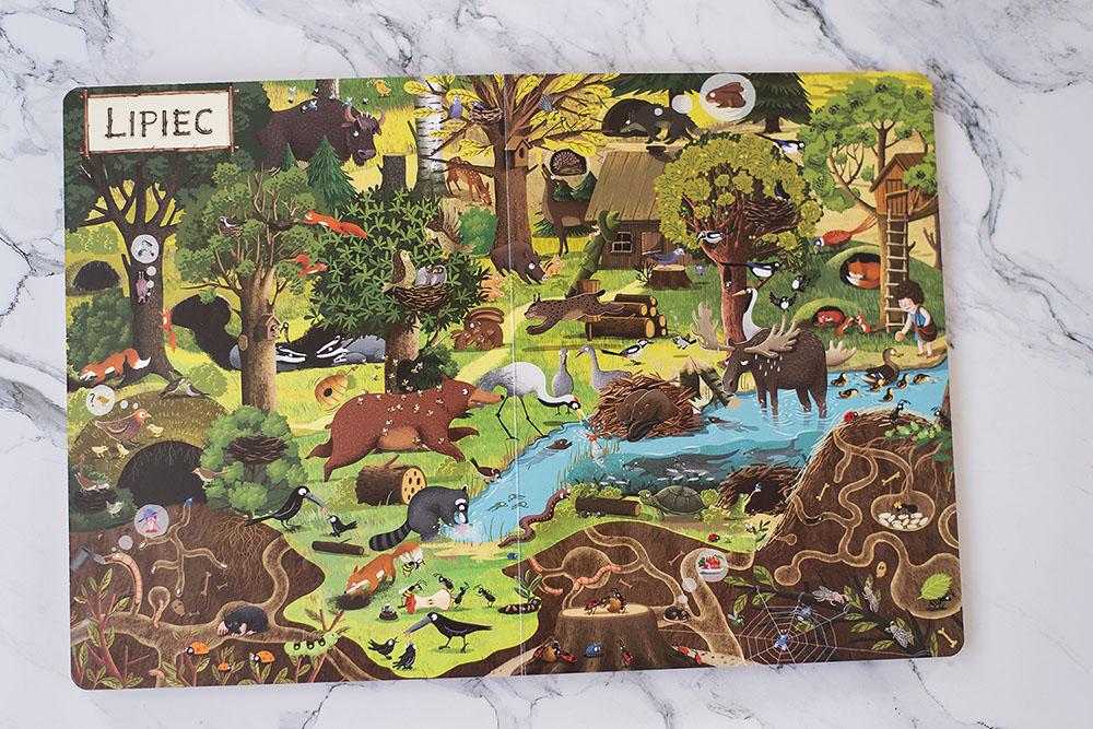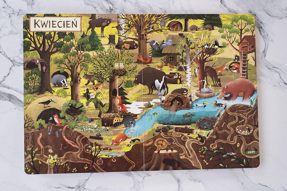 Jeśli wybraliście się kiedyś na spacer w koronach drzew do Pomiechówka, to z pewnością kojarzycie te ilustracje! Przepięknie przedstawiony świat zwierząt i roślin w zmieniającym się cyklu. Każda rozkładówka to inny miesiąc, możemy obserwować aktywność i zachowanie zwierząt i robaczków w różnych okresach roku. Uwielbiamy i możemy oglądać bez końca!