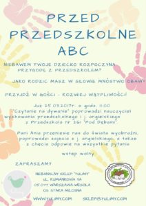 “Zapraszamy serdecznie wszystkich rodziców wraz z dziećmi na bezpłatne zajęcia organizowane w ramach współpracy z Przedszkolem nr 261 „Pod Dębami”. Tym razem na naszym czytankowym dywanie rozgości się Pani Anna Sowa – nauczyciel wychowania przedszkolnego i j. angielskiego z Przedszkola „Pod Dębami”. Pani Ania poprowadzi sobotnią poczytankę i pokazowe zajęcia z j. angielskiego, a także chętnie odpowie na wszystkie pytania rodziców.”