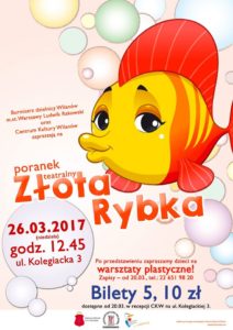 “Centrum Kultury Wilanów zaprasza dzieci i rodziców na uwspółcześnioną wersję bajki „O rybaku i złotej rybce”.