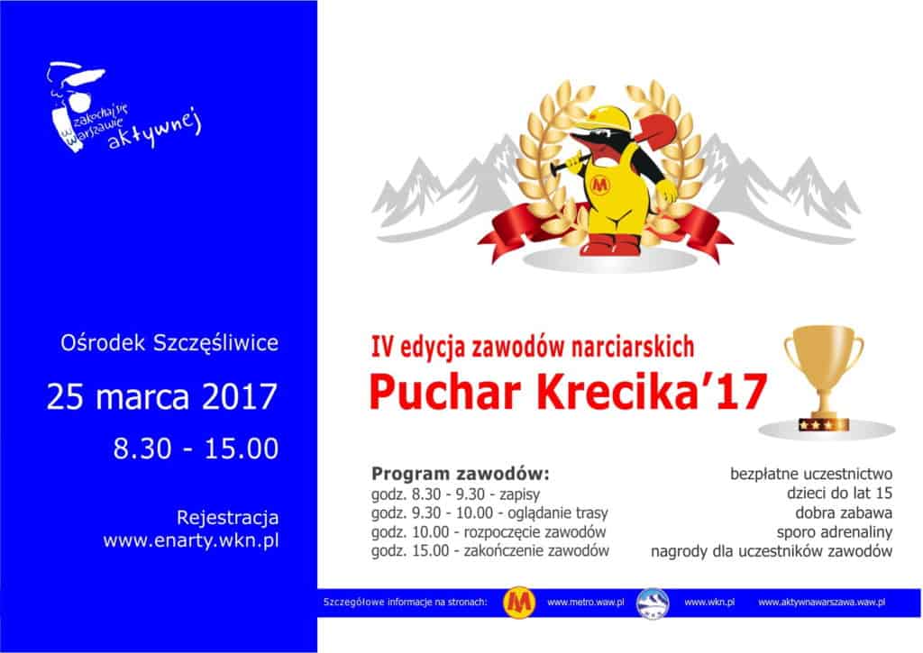 W dniu 25 marca (sobota) na terenie Ośrodka Szczęśliwice w Warszawie odbędzie się IV edycja Zawodów o Puchar Krecika – rodzinna impreza sportowa organizowana przez Spółkę Metro Warszawskie, Stołeczne Centrum Sportu Aktywna Warszawa oraz Warszawski Klub Narciarski. Zawody narciarskie o Puchar Krecika rozpoczną się o godz. 10:00. Uczestnicy zawodów będą mogli zapoznać się z trasą już od godz. 09:30. Konkurs zostanie rozegrany w konkurencji slalom gigant, zgodnie z Narciarskim Regulaminem Sportowym. Udział w zawodach jest bezpłatny. Do udziału w zawodach zapraszamy wszystkich małych miłośników sportów zimowych, a rodziców zachęcamy do kibicowania. Zawodnicy będą klasyfikowani w 5 kategoriach wiekowych, z podziałem na grupy dziewczynek i chłopców. Zgłoszenia do zawodów przyjmowane są wyłącznie za pomocą serwisu http://enarty.wkn.pl/ do dnia 24 marca br. do godz.16.00 oraz w dniu zawodów w Biurze Warszawskiego Klubu Narciarskiego w godz. 8:30-9:00. W zgłoszeniu należy podać: nazwisko i imię zawodnika, płeć i datę urodzenia.