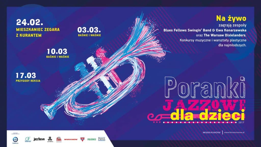 Fundacja Jazz Jamboree i Kino Muranów zapraszają dzieci z rodzicami na niezwykłe spotkania z muzyką i filmem. Repertuar poranków stanowią znane i lubiane filmy animowane dla najmłodszych, a znani i popularni jazzmani są autorami tła muzycznego wykonywanego równolegle z wyświetlanym filmem. Na żywo zagrają zespoły Blues Fellows Swingin’ Band & Ewa Konarzewska oraz The Warsaw Dixielanders.